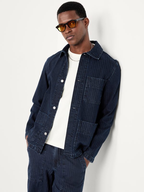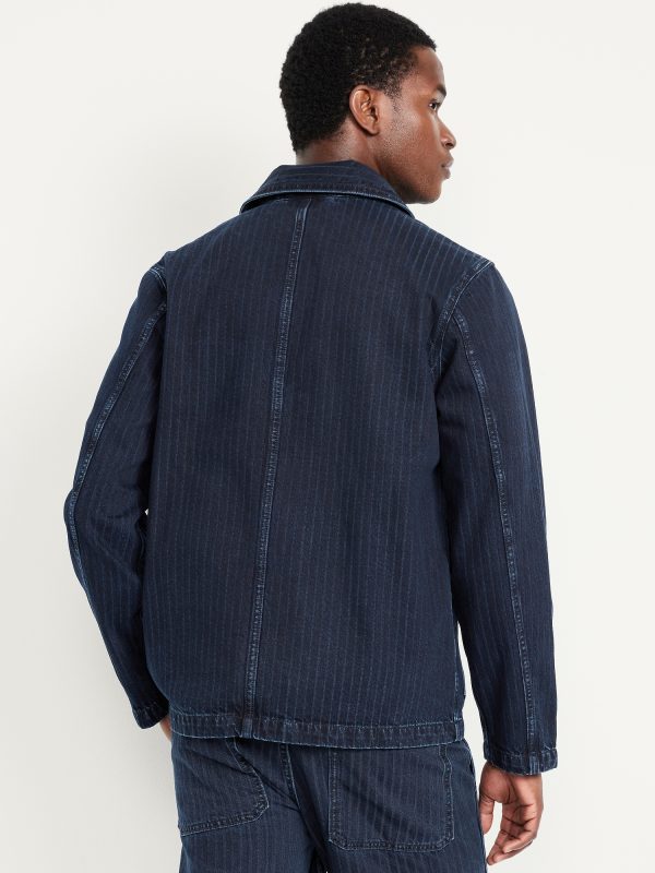 Textured-Stripe Denim Chore Jacket: spread collar, long sleeves, four-button front, chest patch pocket, front patch pockets, #800286