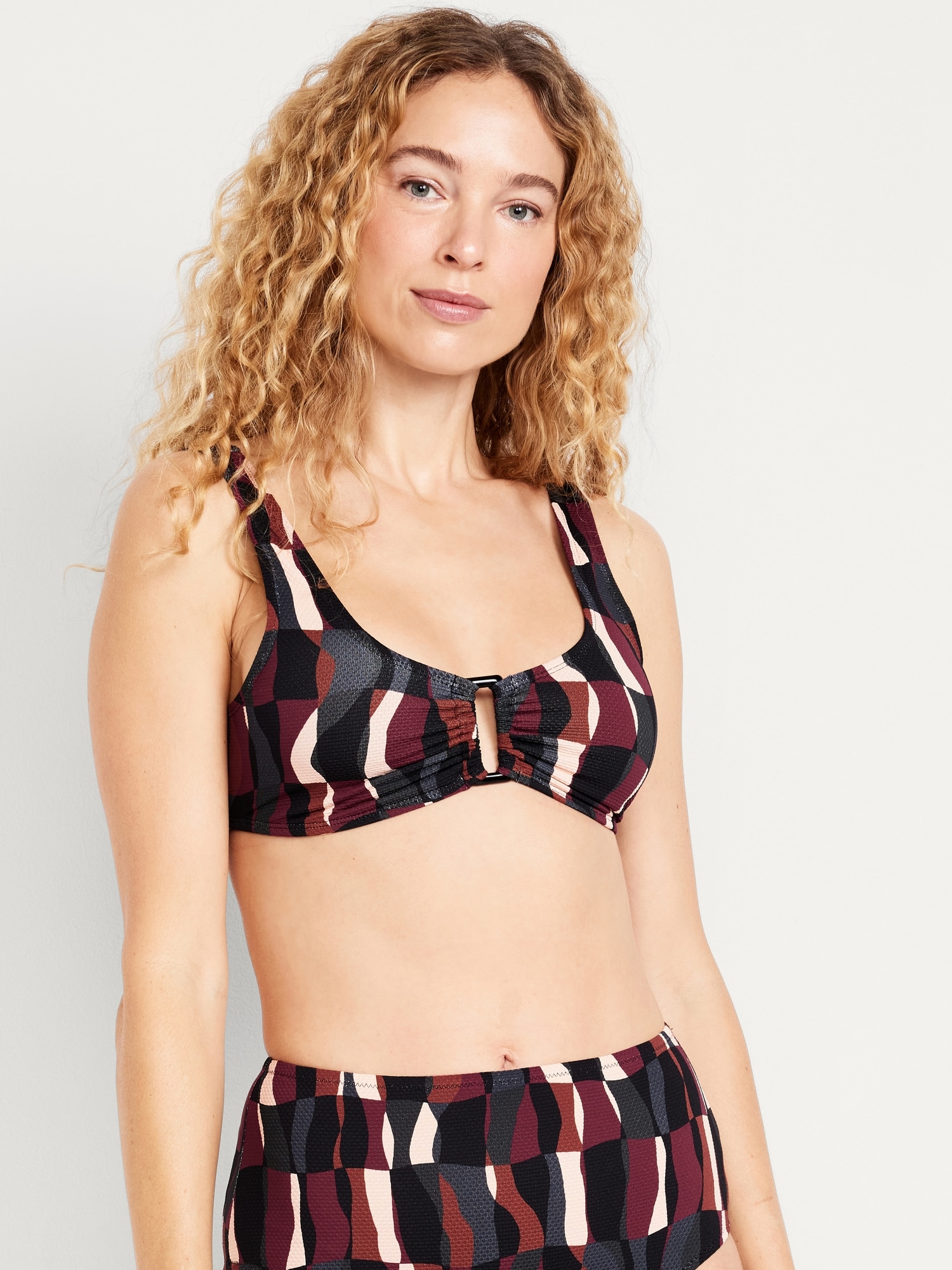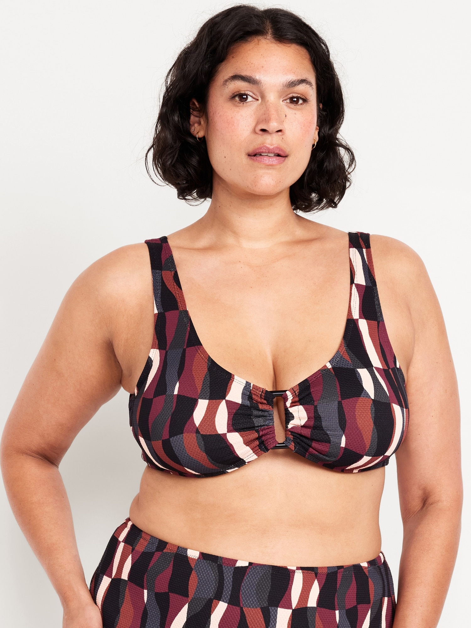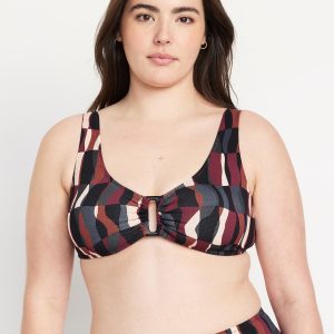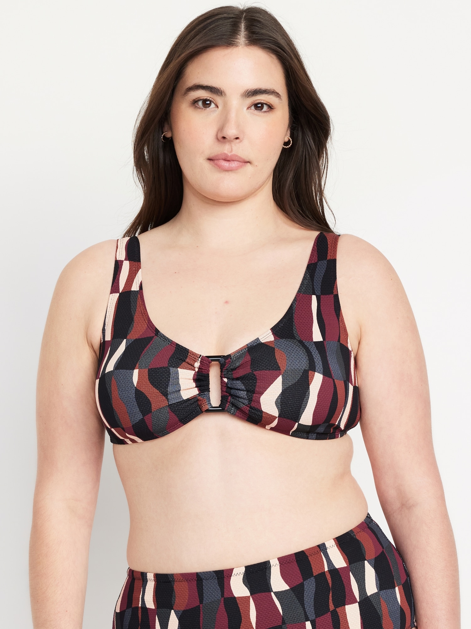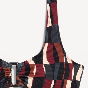 Textured Swim Top: scoop neck, wide straps, ruched front with o-ring accent, removable cups, hook-and-eye clasp at back, #660878