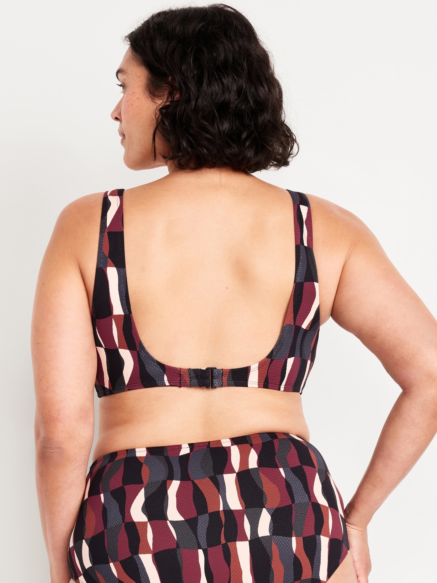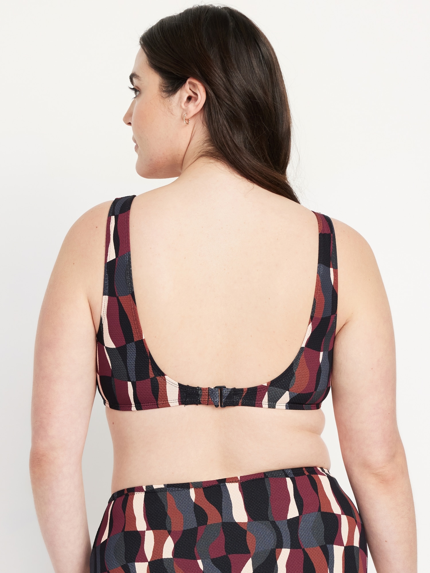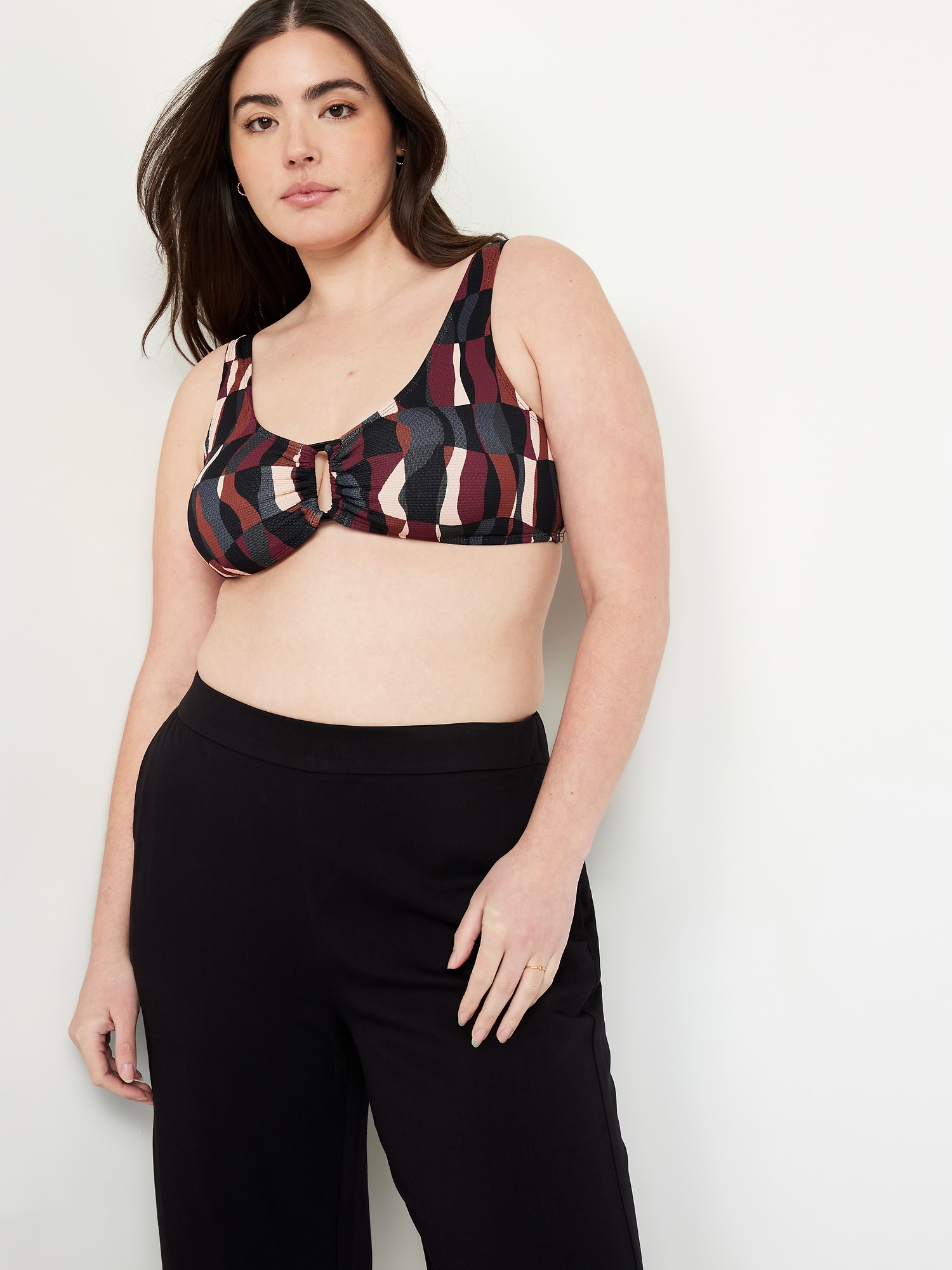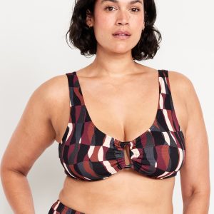Textured Swim Top: scoop neck, wide straps, ruched front with o-ring accent, removable cups, hook-and-eye clasp at back, #660878
