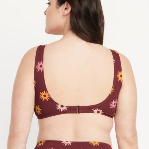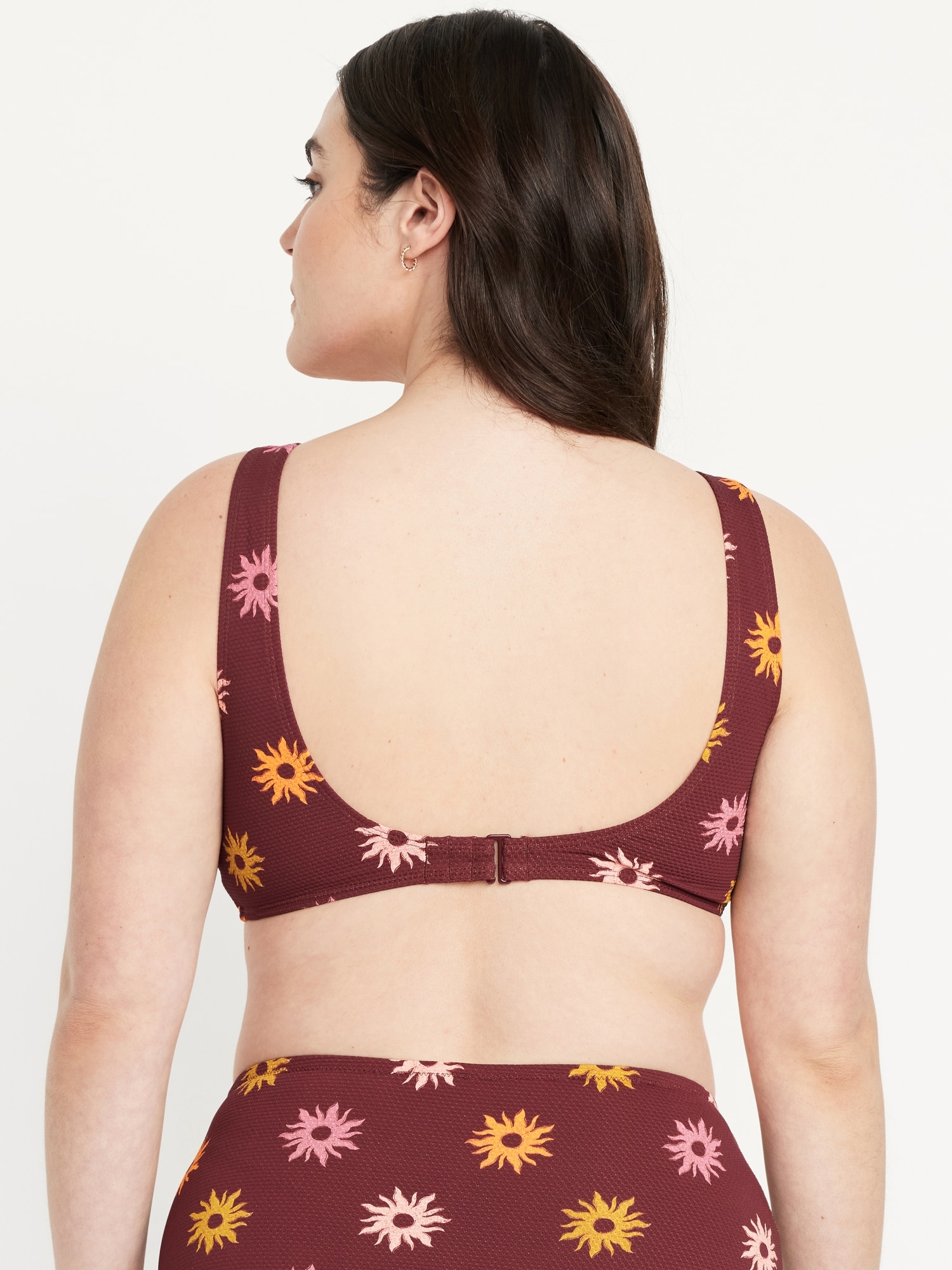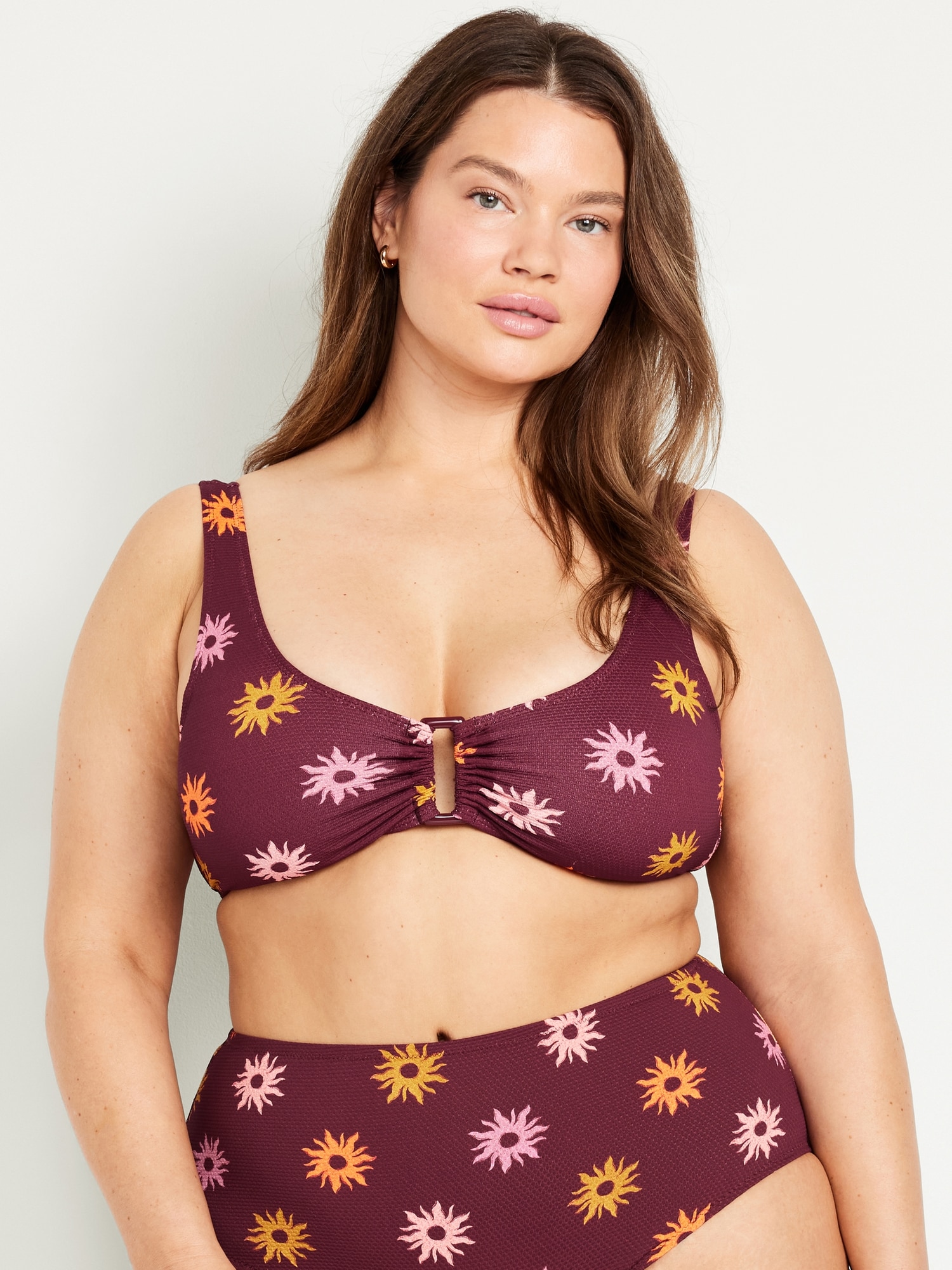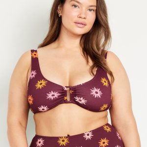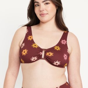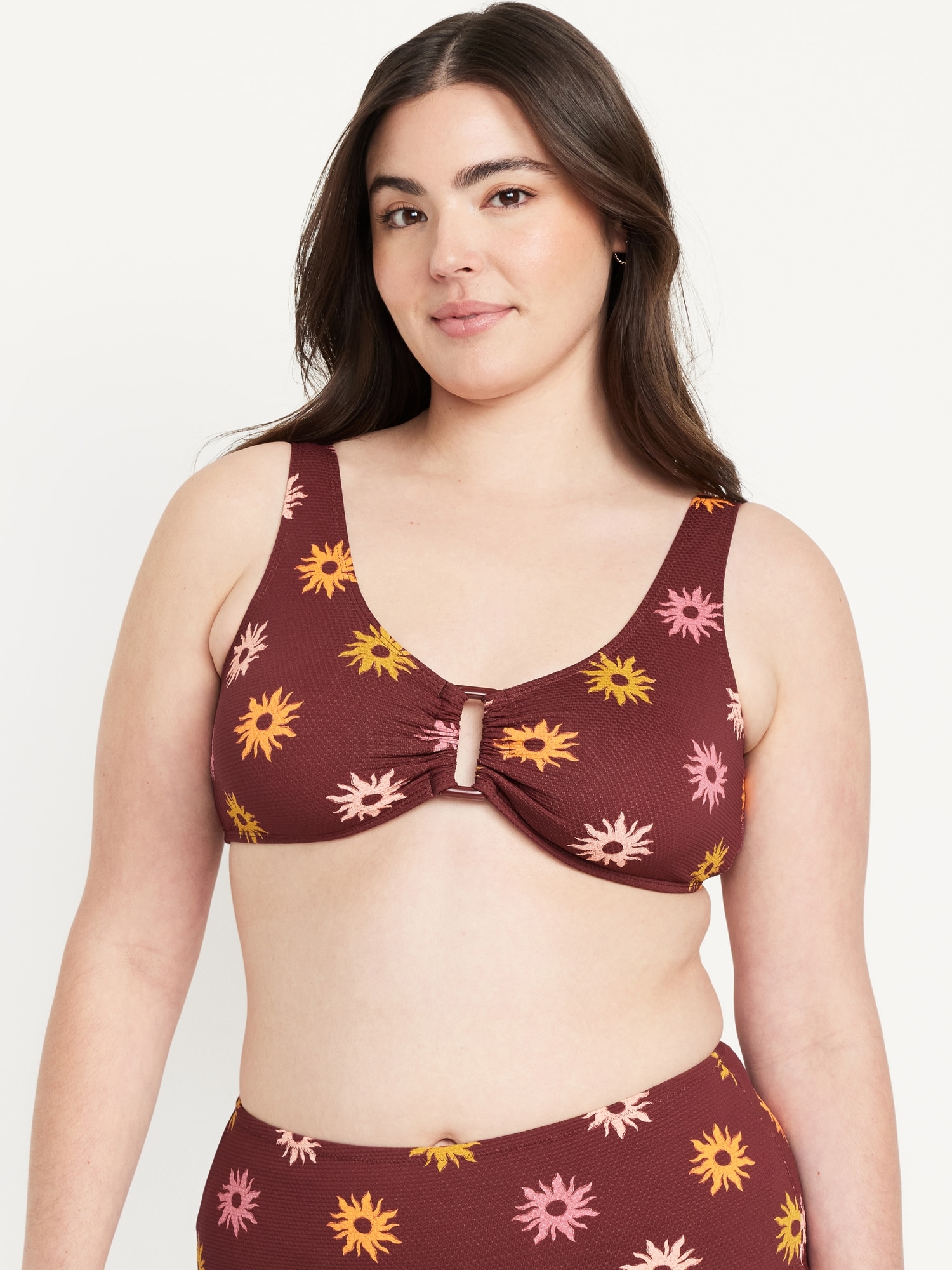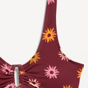 Textured Swim Top: scoop neck, wide straps, ruched front with o-ring accent, removable cups, hook-and-eye clasp at back, #660878
