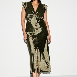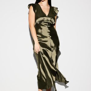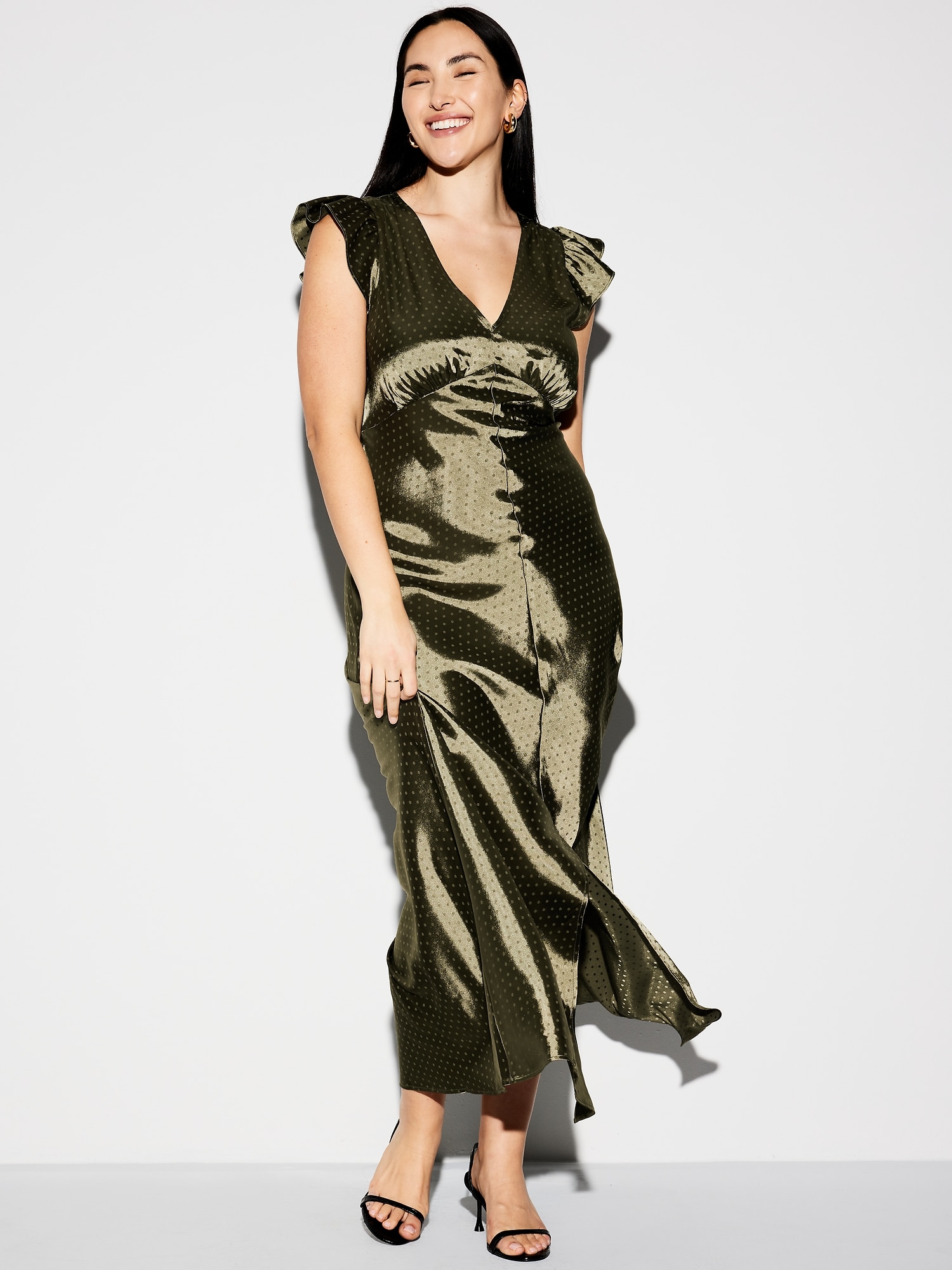 The Occasion by Old Navy Flutter-Sleeve Satin Maxi Dress: New! Special dresses and sets, made to make an entrance.deep v-neck, flutter-trim arm openings, seamed empire waist, center back elastic for comfort, front center slit, shirred detail, subtle tonal dots for a more dressed-up look, for parties, proms, graduations, weddings — these looks love an RSVP, #705416