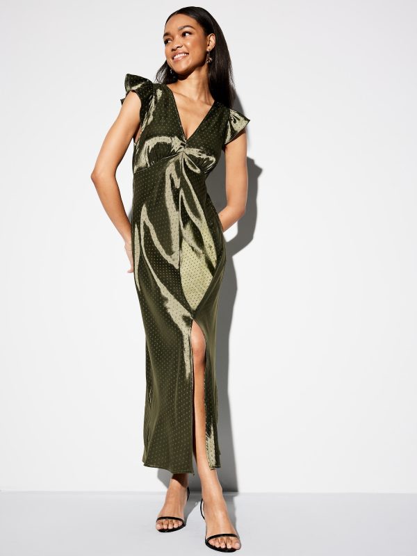 The Occasion by Old Navy Flutter-Sleeve Satin Maxi Dress: New! Special dresses and sets, made to make an entrance.deep v-neck, flutter-trim arm openings, seamed empire waist, center back elastic for comfort, front center slit, shirred detail, subtle tonal dots for a more dressed-up look, for parties, proms, graduations, weddings — these looks love an RSVP, #705416