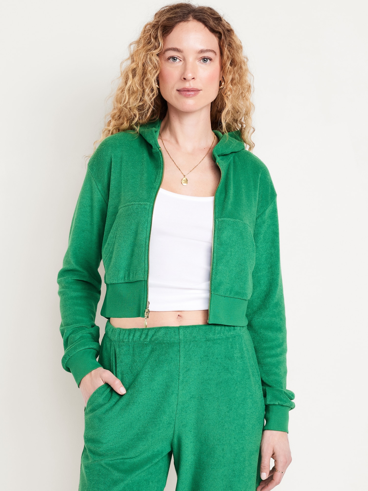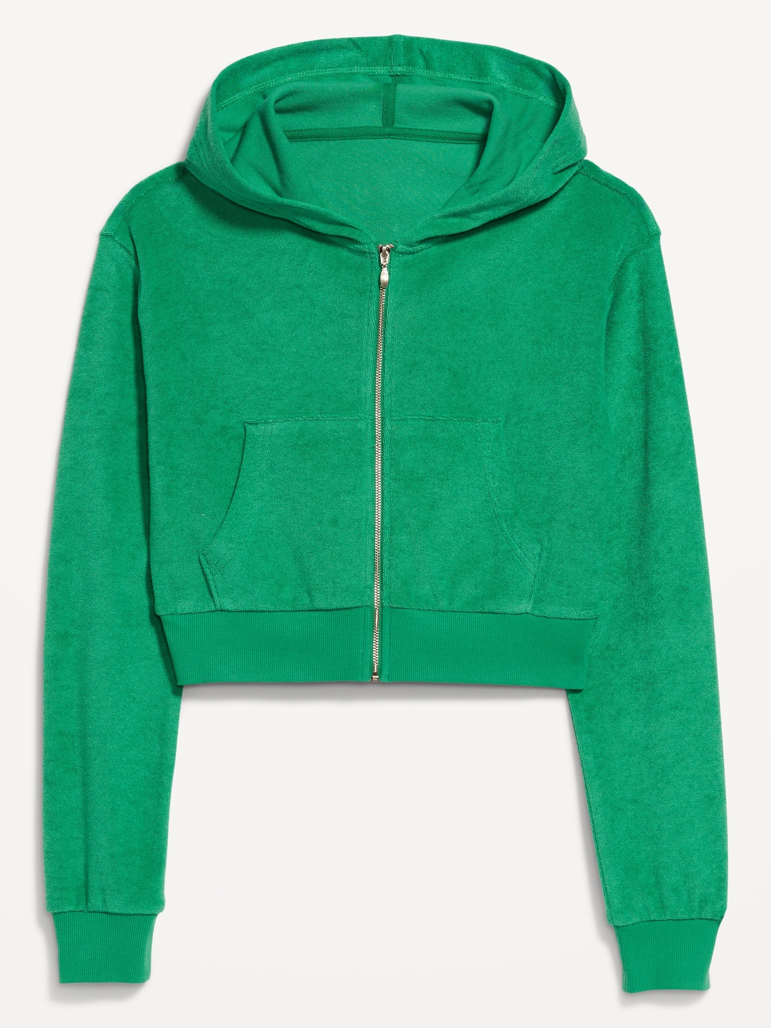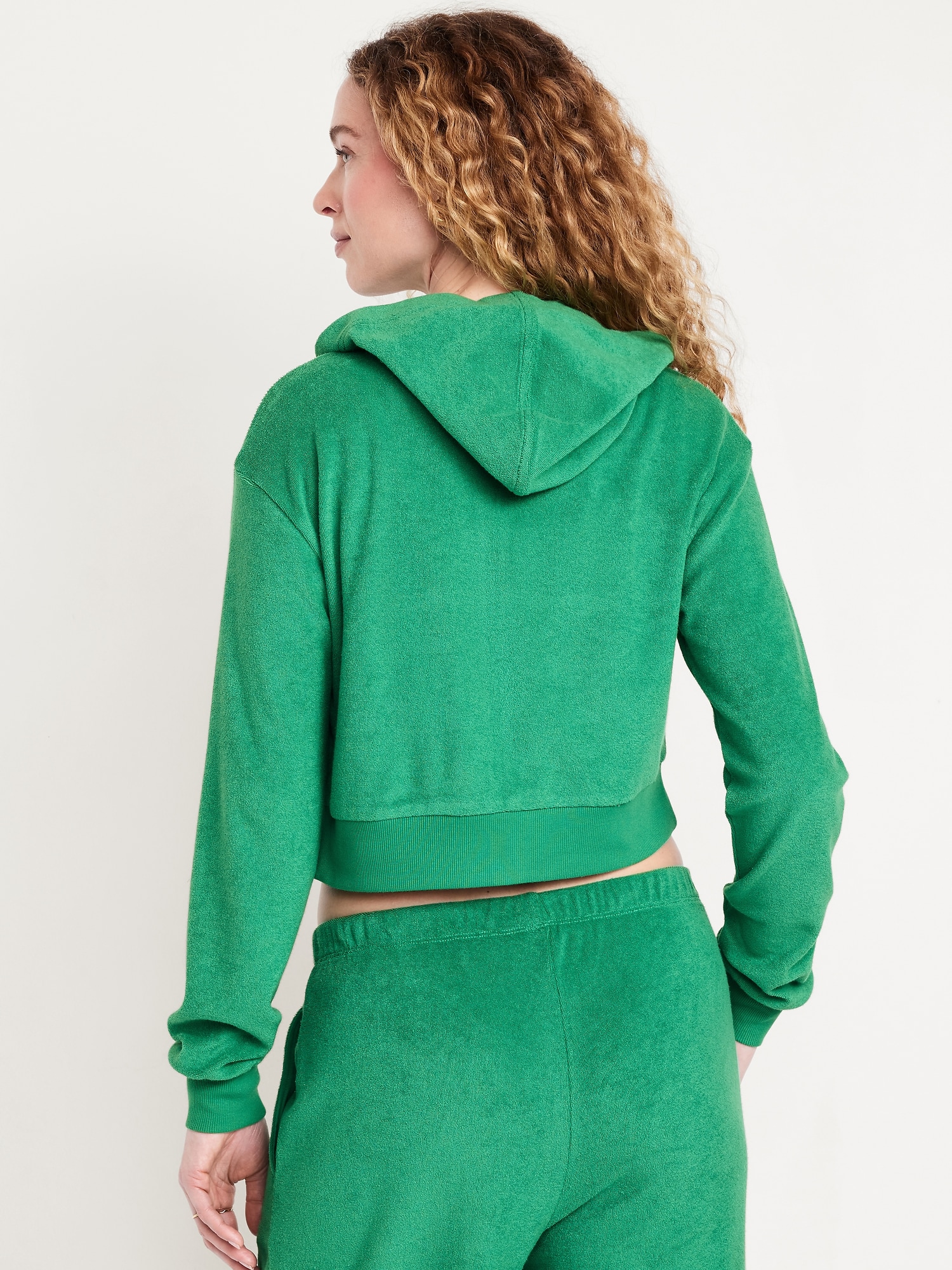Towel Terry Crop Zip Hoodie: built-in hood, long sleeves, full-zip front, hand-warming pockets, rib-knit trim, #761817