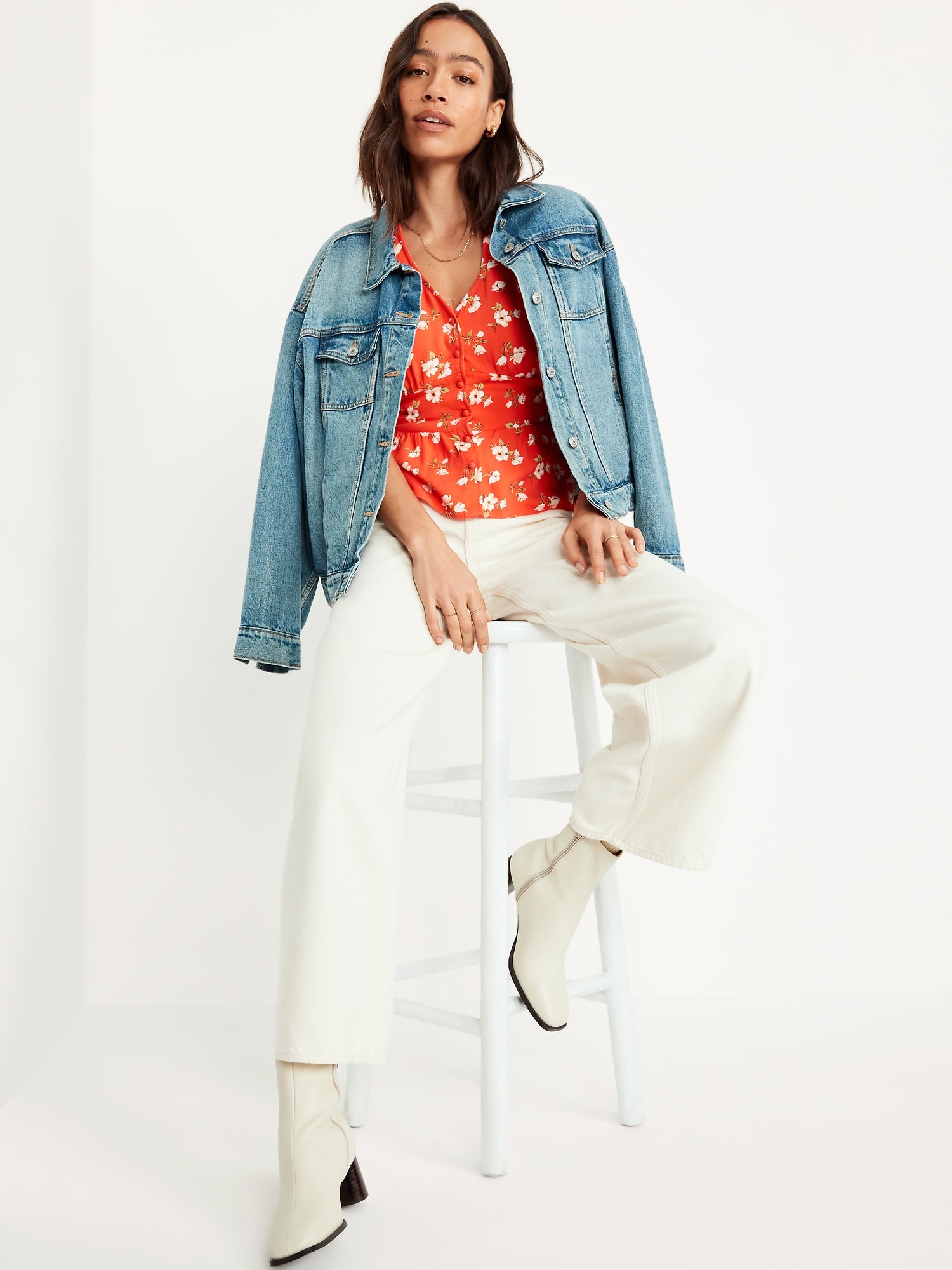 V-Neck Button-Down Crepe Top: v-neck, short flutter sleeves, button front, shirred shoulder seams, smocked back waist, #704153
