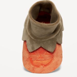 Velour Pumpkin Slippers for Baby: bat features at front, faux-suede outsole, textured gripper dots, cozy cushioned foot bed, #787534