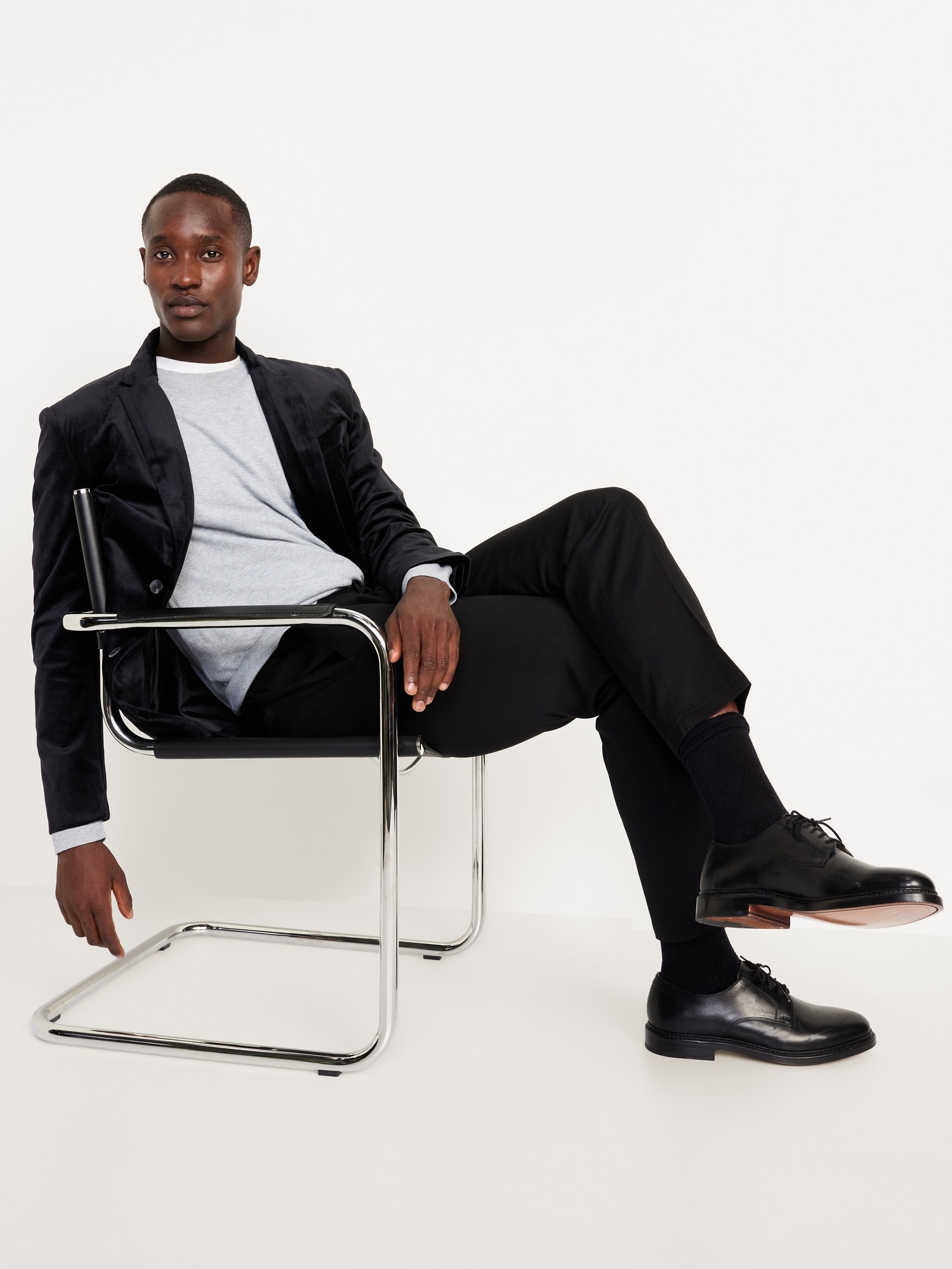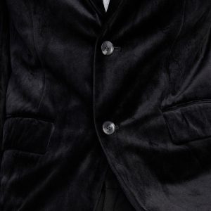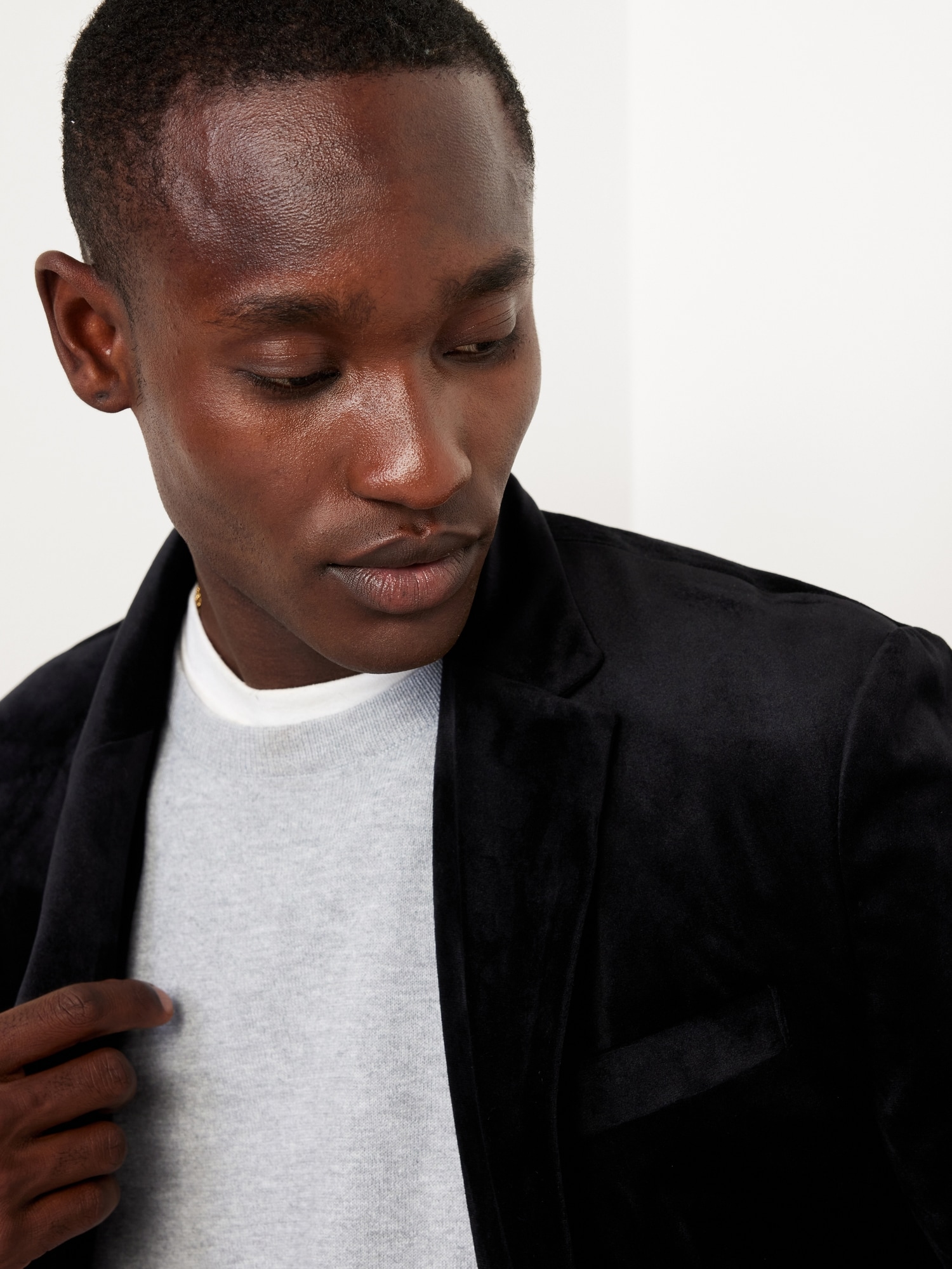 Velvet Blazer: notched lapel, long sleeves, double-button front, welt chest pocket, front flap pockets, hanging loop, #564227
