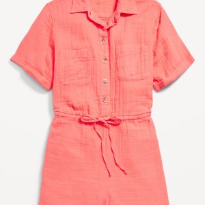 Waist-Defined Crinkle Gauze Romper: A light, rippled fabric that’s begging to be beachside.spread collar, short sleeves with rolled cuffs, button front, elastic waist with functional tie, patch chest pockets, diagonal front pockets, shirred detail, #705713