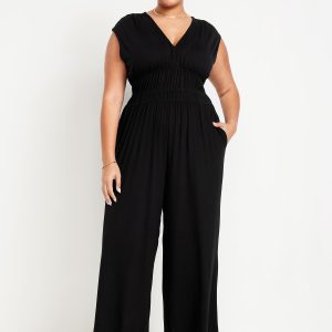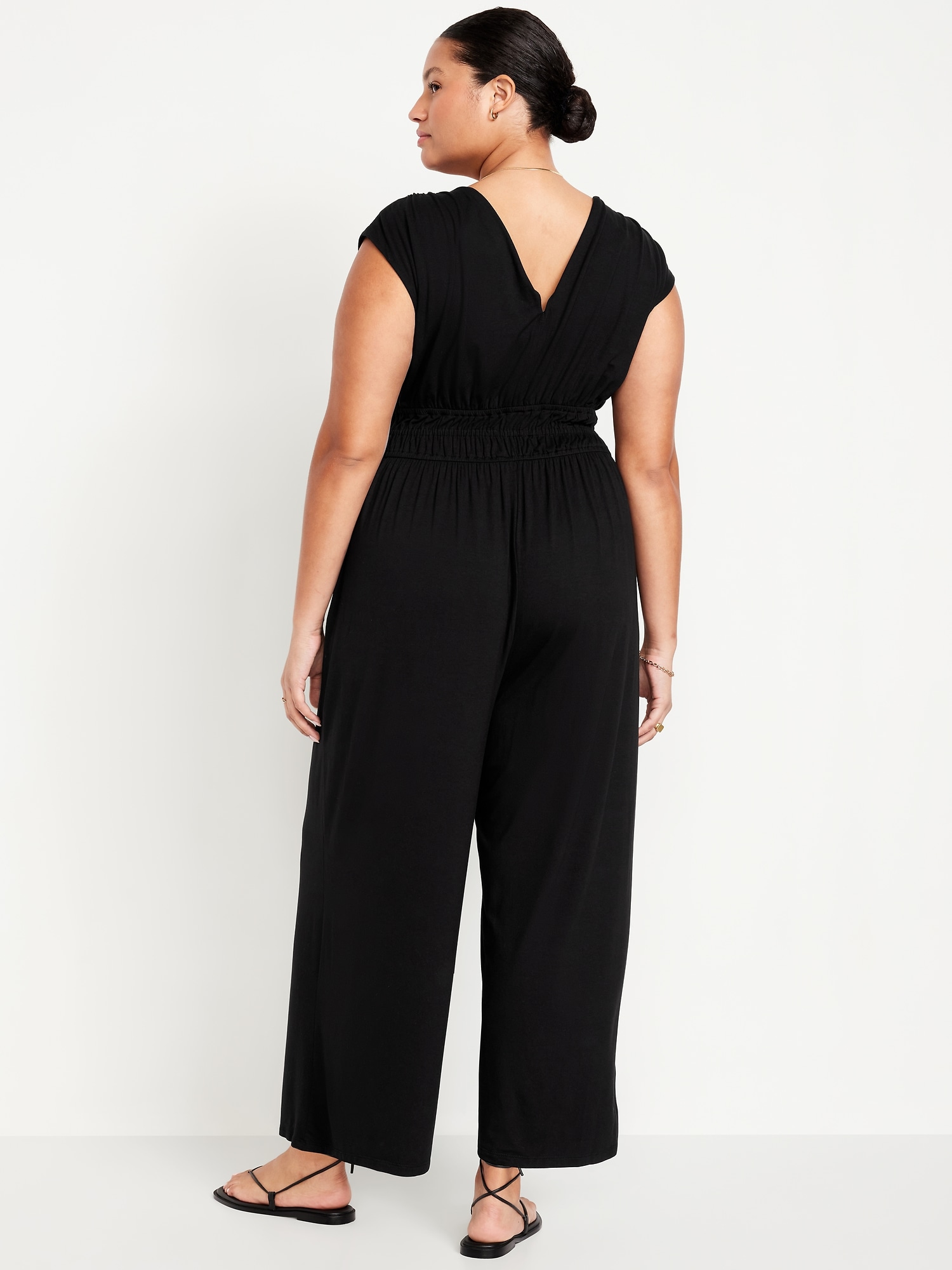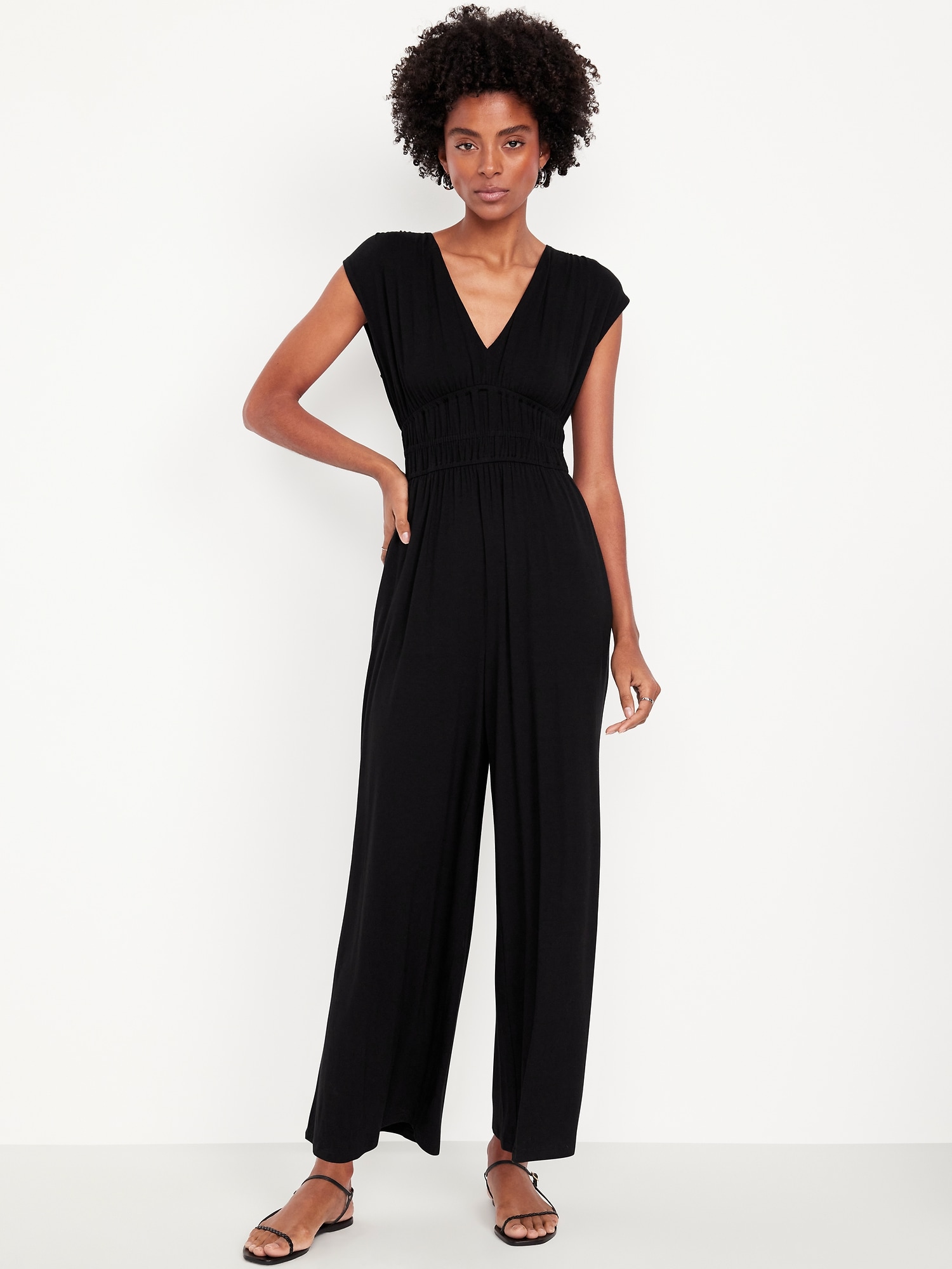 Waist-Defined Wide-Leg Jumpsuit: deep v-neck, sleeveless, elastic waist, on-seam hip pockets, wide leg, #705285