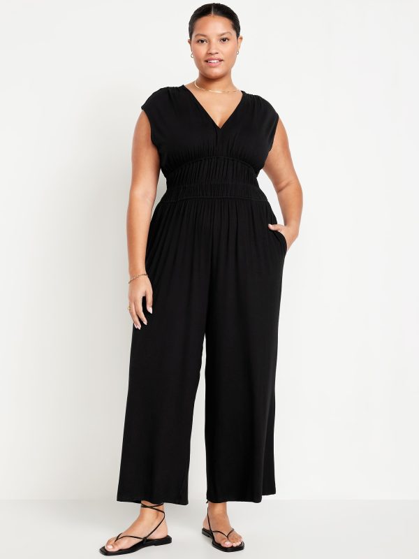 Waist-Defined Wide-Leg Jumpsuit: deep v-neck, sleeveless, elastic waist, on-seam hip pockets, wide leg, #705285