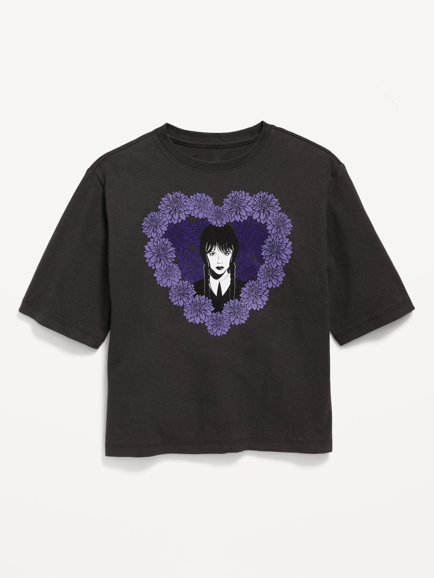 Wednesday™ Graphic T-Shirt for Girls: crew neck, short elbow-length sleeves, drop shoulders, licensed graphic, ™ & © 2025 Netflix Inc., #810454