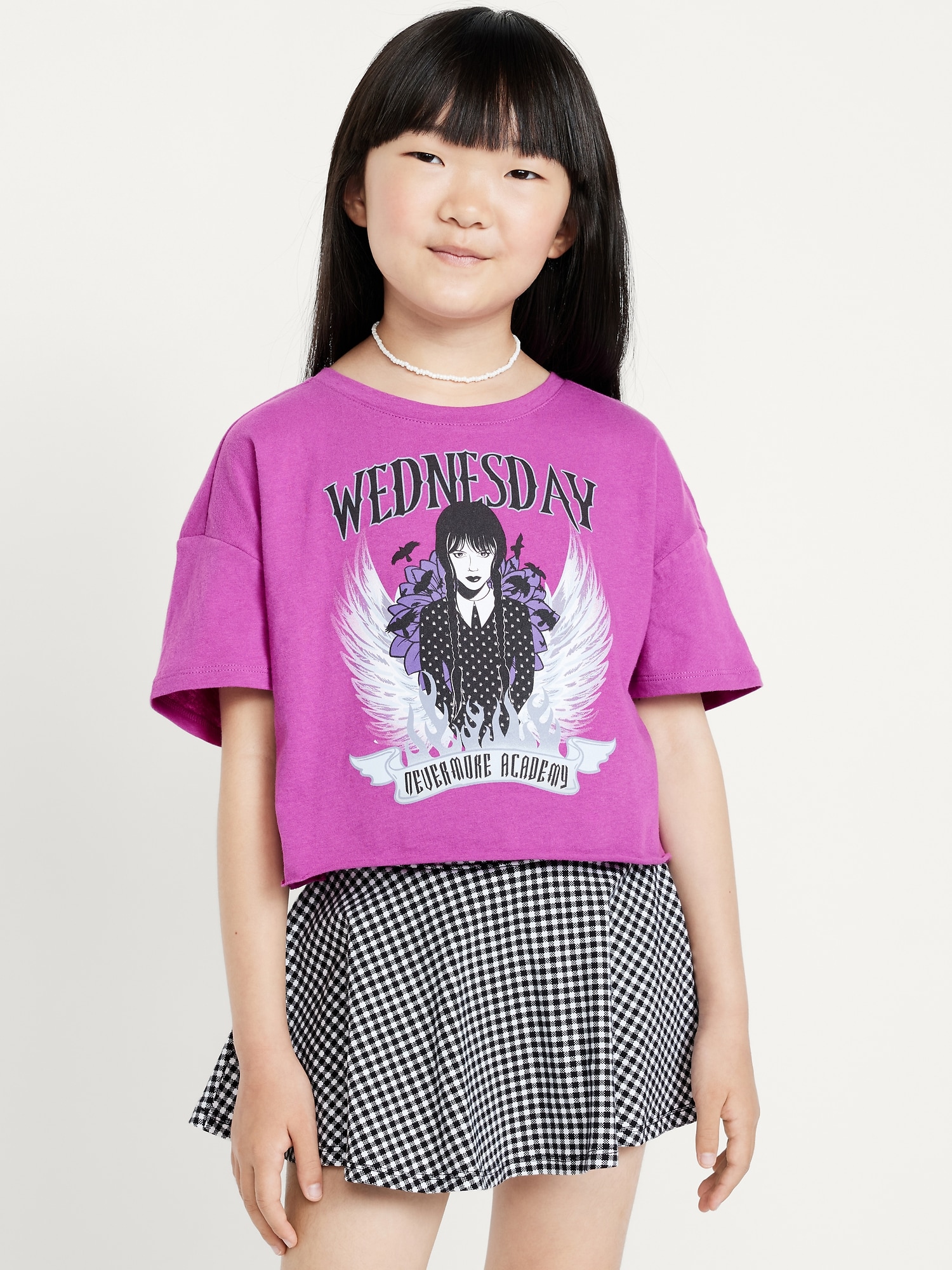 Wednesday™ Oversized Cropped Graphic T-Shirt for Girls: crew neck, short sleeves, licensed graphic, ™ & © 2025 Netflix Inc., on wednesdays, she wears purple (duh)., #763491