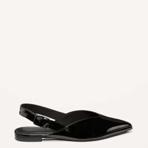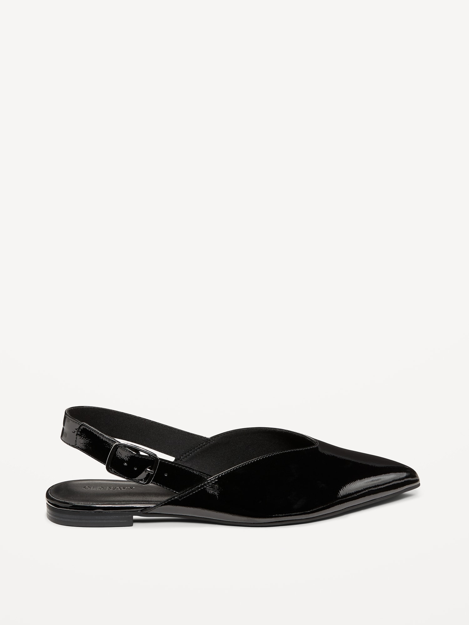 Wide Strap Slingback Flats: pointed toe, V-cut, buckle fastening at ankle, open heel, firm foot bed, textured outsole, #750760