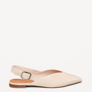 Wide Strap Slingback Flats: pointed toe, V-cut, buckle fastening at ankle, open heel, firm foot bed, textured outsole, #750760